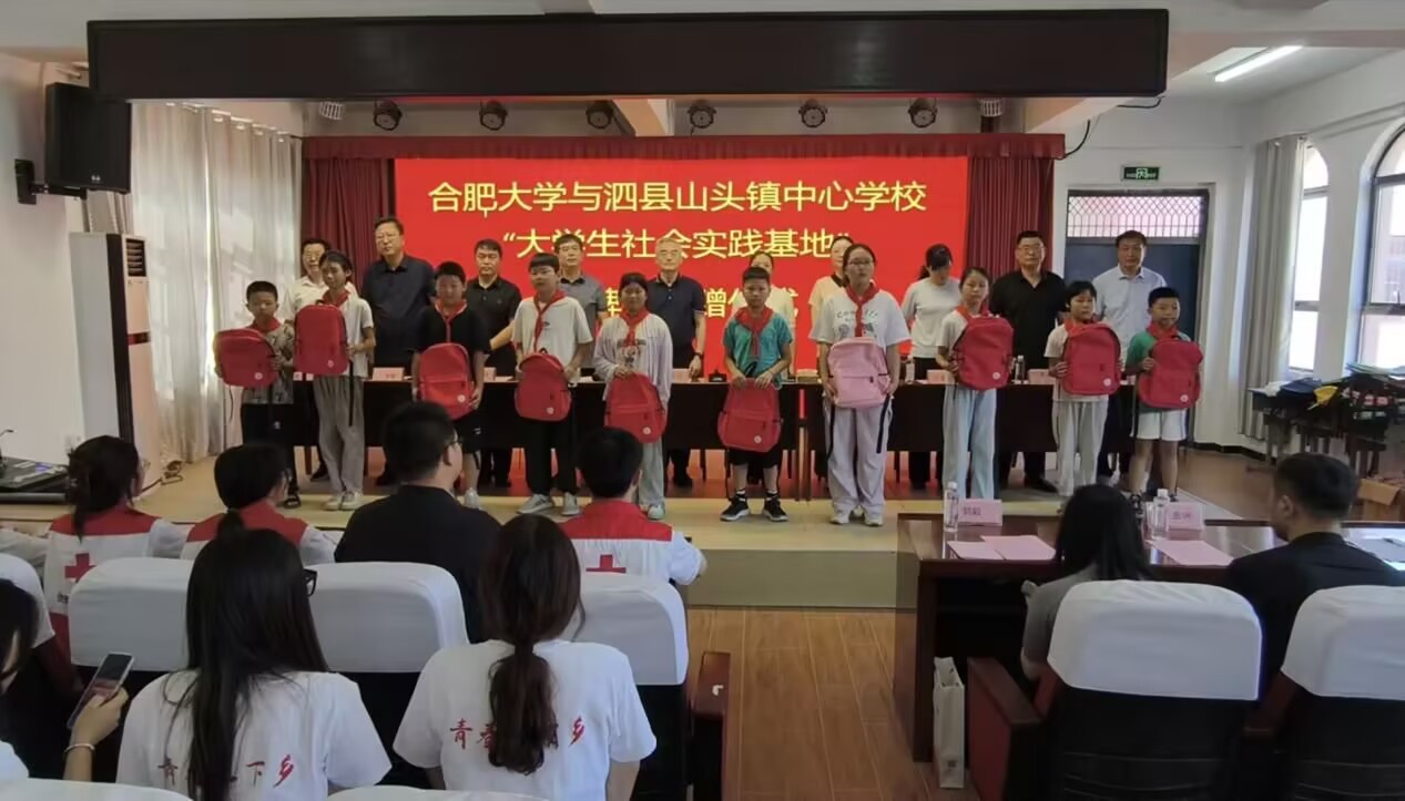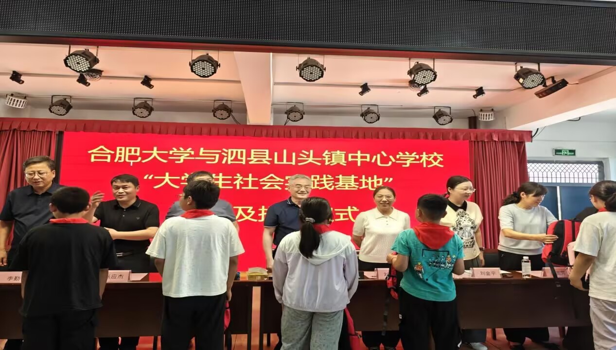 等物資,為孩子們帶來知識的滋養(yǎng)。隨后,“合肥大學生社會實踐基地”正式授牌,這標志著合肥大學與泗縣在實踐育人、校地合作方面開啟了新的篇章。