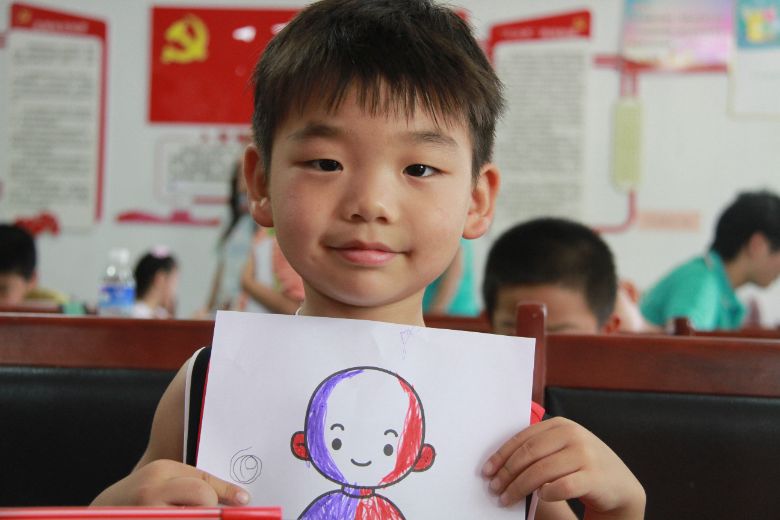 接下來,團隊為小朋友們下發印有卡通人物的圖畫,請小朋友們用水彩筆畫出自己心中的民族特色服飾。小朋友們發揮天馬行空的想象力,將心中對美的認知繪制成童年最亮麗的底色。當得到大哥哥們獎勵的小紅花時,小朋友們會自信地舉起自己的杰作,對著鏡頭露出爛漫的笑容。張浩軒小朋友說:“我很喜歡苗族的衣服,我覺得他們的衣服亮閃閃的,看起來很漂亮。”也有小朋友自己設計了一套別具特色的服飾,在鮮艷的色彩對比中,展現出小朋友的獨特審美。
