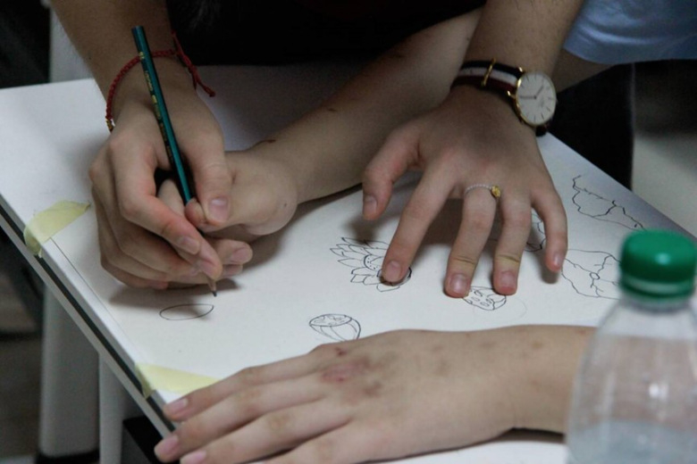 圖1/志愿者在輔助孤獨癥孩子繪畫