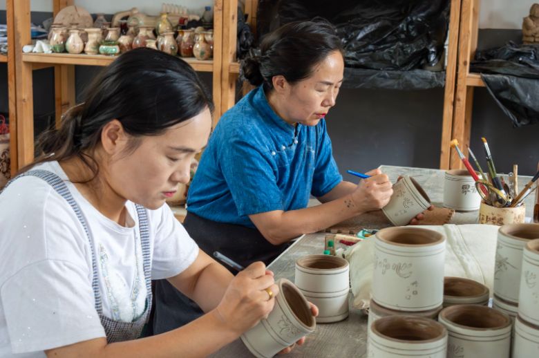 圖為邢淑芹老師和她的弟子為彩陶刻畫圖案。田澤坤攝