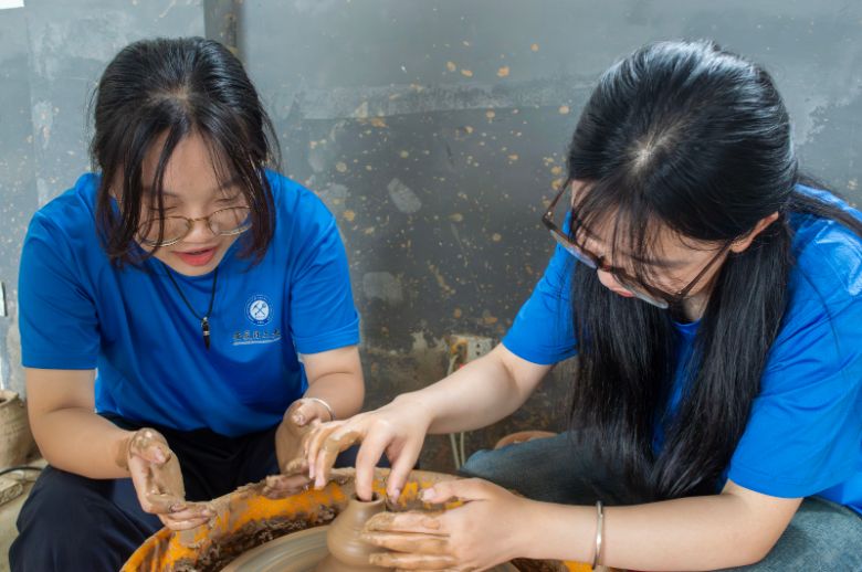 制陶工坊內,拉坯工序成為傳統技藝的活態課堂。制陶大師盧老師演示的“三穩”心法——手穩、眼穩、心穩,讓調研團成員在陶泥坍塌與重塑的實踐中,體悟到傳統工藝對身心專注力的極致要求。當拇指與食指按壓陶泥的瞬間,千年傳承的制陶技藝在現代指尖下獲得短暫共鳴。