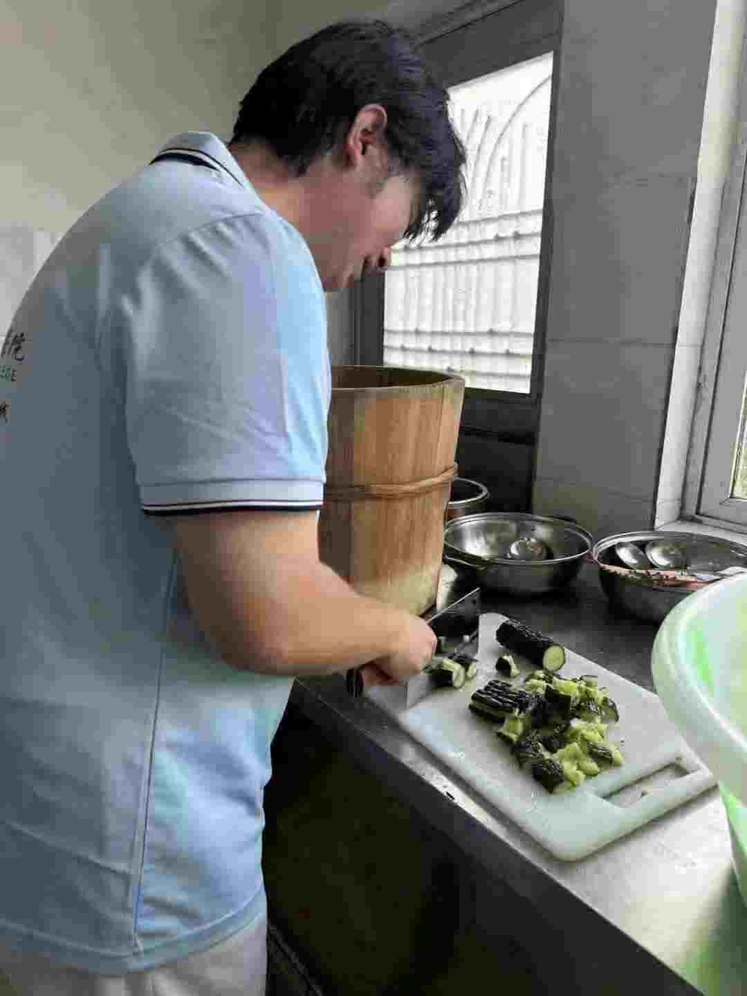 結束了一上午的宣講或勞動,團隊生活的另一面在臨時搭建的簡易灶臺旁展開。采購食材、洗菜切配、生火掌勺……這些在城市里依賴外賣和食堂的“廚房小白”,在海寨社區開始了自力更生的挑戰。