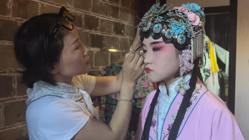 下午,實踐團開啟沉浸式戲曲體驗。在專業老師指導下,成員們親歷戲曲妝造過程。繁復的工序、精細的筆觸勾勒,令大家深切體會到舞臺形象塑造的獨特講究。隨后,成員們學習圓手、敬禮、托臉等基礎身段,于簡單招式的一板一眼間,體悟戲曲藝術嚴謹細膩的深厚功底。