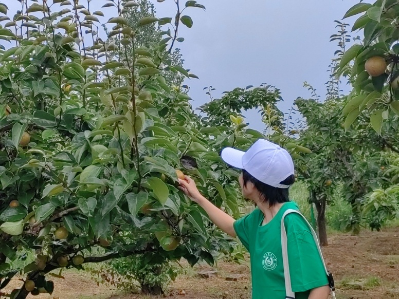 潘教授還帶領實踐團參觀了合作社及曹莊富硒生態園。梨園枝繁葉茂,翠綠的果實掛滿枝頭。這樣一個生意盎然的天然氧吧每年都會吸引大量游客,有助于芝山村實現“農業+旅游業”的雙重創收。