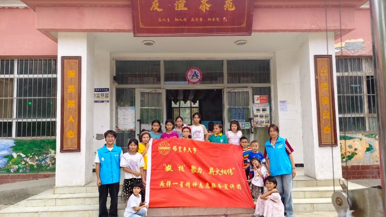 (圖為阿克蘇地區(qū)友誼社區(qū)茶苑門前與青少年合影)