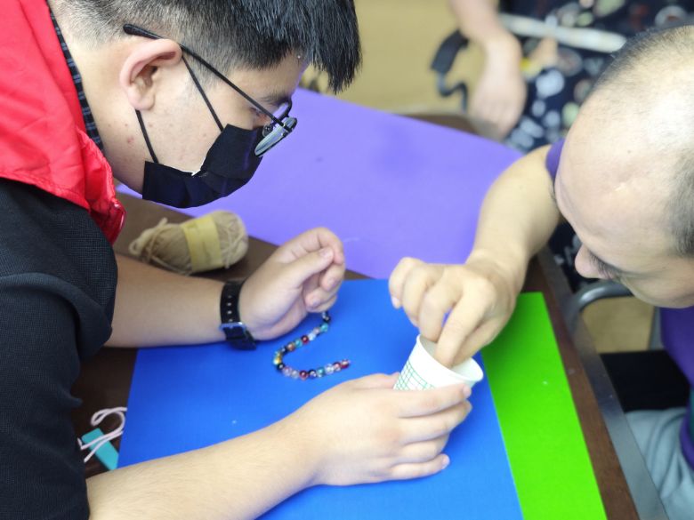 活動伊始,負責人簡要介紹了流程。考慮到老人們的身體狀況,志愿者們特別注重細節(jié):將材料按顏色、類型清晰地分類擺放,細心保管剪刀、珠子等物品,確保老人們的安全,并采取重點關注與廣泛關注相結合的陪伴模式。