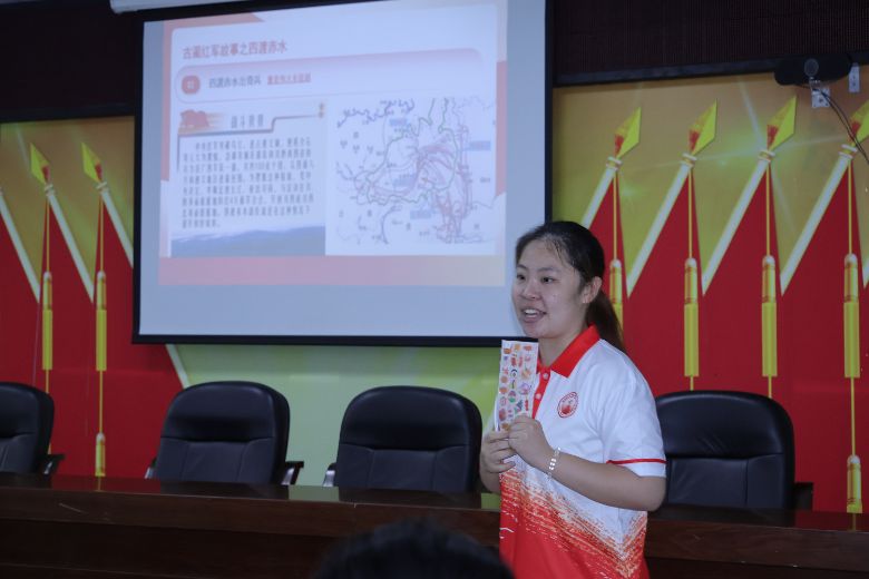活動伊始,紅色文化宣講員郭欣汝以“長征路線知多少”“家鄉有哪些英雄”等問題引發熱議,孩子們稚嫩的分享為課堂鋪就共情底色。隨后,她聚焦本土,講述古藺英雄陳紹清的故事:長征路上,他在槍林彈雨中穿梭,四渡赤水、強渡大渡河、飛奪瀘定橋,處處可見其奮勇身影,尤其在瀘定橋一役中,不顧生死救下受傷戰友。孩子們屏息聆聽,在歷史細節中觸摸革命溫度,感悟先輩舍生取義的精神。