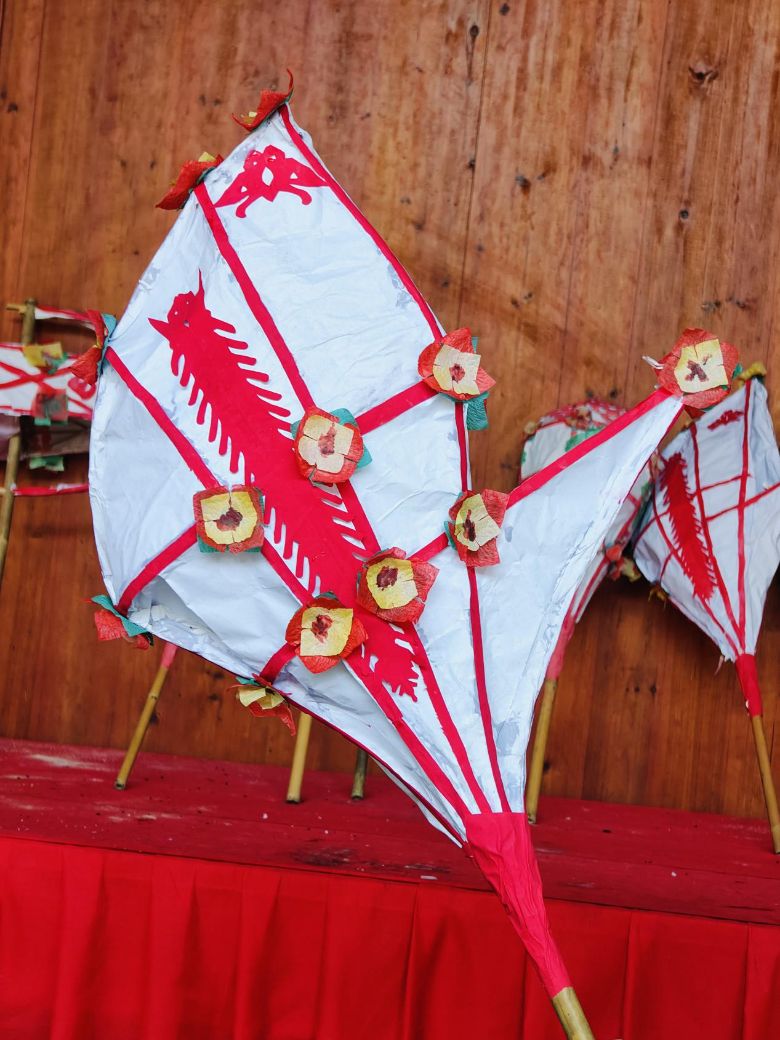 第二步裁華箋:隊員們用黃、紅、綠三色“種花紙”裁剪象征吉祥的花朵。更具挑戰的是用紅紙剪蜈蚣,需細致穩定的手法,汪師傅耐心指導著每一剪。剪好的蜈蚣、蝴蝶與花朵被精心粘貼在燈面固定位置,為素雅燈體注入生機與民俗韻味。完成后的燈體需靜置風干。汪師傅介紹,正月吉時燈內放置蠟燭,燭光穿透彩紙,這些花鳥蟲獸便會在光影中舞動,映照出祈福納祥的華美篇章。