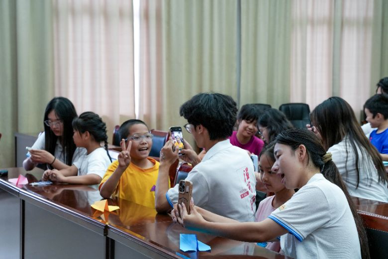 以紙飛機互動引導孩子進入科技主題,以逐一組裝方式向孩子展示無人機設備。在青少年全程專注觀摩的過程中,無人機完成升空、懸停、轉向等基礎演示,活動激發了青少年濃厚的科技興趣,大家就設備安裝調試流程、操控原理與實踐技巧等踴躍提問,實踐隊成員均進行了細致專業的現場解答。