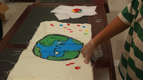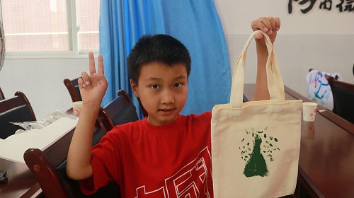 童心共護青山綠,數智繪就生態章。團隊聚焦生態文明理念培育,以VR技術賦能環保教育,讓環境“清”起來。孩子們通過垃圾分類模擬系統進入1:1還原的家庭生活空間,完成垃圾投放任務。錯誤操作會觸發土壤污染動畫演示,正確分類則展示資源化處理流程,強化環保意識。塵肺病防治模塊讓孩子“走進”礦山作業現場,觀察粉塵擴散路徑,并通過設備感知呼吸阻力變化,直觀理解工業污染對健康和環境的雙重危害。污水治理培訓系統則以動態粒子模擬污水處理全過程,當水質達標時清澈水流的畫面與歡呼聲同步,正面反饋極大激發了孩子們主動參與環保的責任感。隨后,“技能+N數智小學堂”通過帆布袋創作、環保手印等活動,讓責任“行”起來。孩子們描繪出“戴口罩的地球”“垃圾分類小衛士”等圖案,并按下靛青指印連成“綠色希望山脈”,高舉作品宣言“保護生態,從我做起”,實現從科技認知到社會行動的價值轉化。