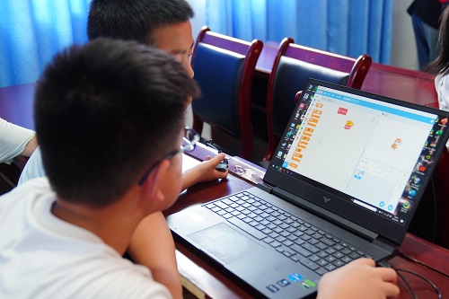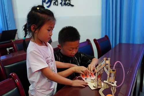 童心點燃代碼光,數智之翼啟遠航。團隊聚焦數字素養啟蒙,播撒科技創新種子,以VR技術賦能編程教育,讓邏輯“動”起來。志愿者通過講解VR眼鏡的工作原理,幫助孩子們建立對虛擬現實技術的初步認知。隨后,孩子們在圖形化編程界面中拖拽“積木式”模塊,理解坐標移動、循環執行等基礎概念,逐步形成計算思維。全息影像環節中,孩子們親手制作三棱鏡裝置,在調試角度與光源位置的過程中,揭開立體成像的技術面紗。機械臂體驗課上,孩子們使用吸管、橡皮筋制作機械爪,在“夾球挑戰”中理解摩擦力、力矩平衡等物理知識,逐步形成“原理認知—模型制作—優化改進”的工程思維過程。科技主題T恤繪制則激發孩子們的藝術創造力,將飛船、機器人等未來想象轉化為視覺表達,完成“技術認知—工程實踐—創意表達”的素養進階。讓能力“燃”起來,讓夢想“飛”起來,讓科技的種子在童心中悄然萌芽。