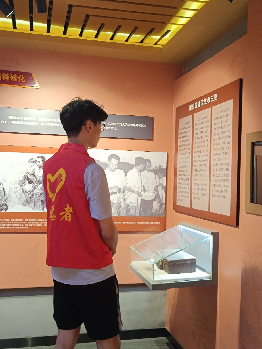 伴隨著實踐隊員們步入紀念館內,一片莊重嚴肅的氛圍撲面而來。向我們展現的是一幅幅經過了歲月洗禮照片,一件件飽含歷史韻味的物件和一座令人敬畏的周總理的雕像。這里的一切都在記錄著周恩來總理曾經的點點滴滴,在這里可以看到周恩來總理的的方方面面。周恩來總理穿過的中山裝,他使用過的鉛筆,周總理送給毛主席的帽子等等,全都陳列在館內。在參觀過程中,實踐隊成員認真聆聽講解員的生動講述,通過一幅幅珍貴的歷史圖片、一件件飽含故事的實物,深入了解了周恩來總理為黨和人民事業不懈奮斗的光輝一生。在講解員的介紹下,實踐隊員們對于周總理的了解愈發深刻。總理的崇高品德、偉大風范以及他對黨和國家的無私奉獻,深深打動了每一位隊員的心。
