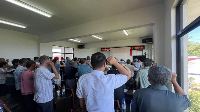 早上8時,柿樹嶺村委會迎來了熱鬧的人群,黨員同志們陸續進入村委會,他們的胸前是熠熠生輝的黨徽,面容上是油然而生的自豪感與喜悅感。早上9時,村委會三樓會議室中便已座無虛席,柿樹嶺村慶黨104周年暨七一黨員大會正式開始。