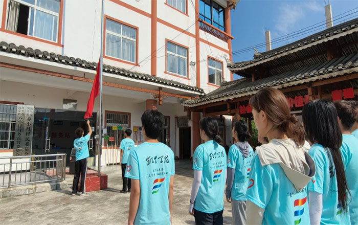 7月7日清晨,院凱里學院美術與設計學“繪美童心,藝路同行”暑期社會實踐團與養小村村干部、村民代表齊聚養小村黨群服務中心廣場,共同舉行莊嚴的升旗儀式,以昂揚姿態開啟新一天的實踐活動。