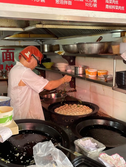 兜兜轉轉我們找到街角的一家小面館,雖然店面不大,招牌簡陋,但客人卻不少。我們在店里點了一碗蔥油面。蔥油面的制作過程如同一場精彩的表演。老板現場熬制蔥油,將蔥段放入熱油中,隨著油溫的升高,蔥段逐漸變成金黃色,蔥香彌漫在整個空間。接著加入生抽、老抽等調料,煮成濃郁的蔥油汁。煮好的面條細而勁道,淋上蔥油汁后,每一根面條都仿佛被賦予了靈魂,散發著誘人的光澤。鏡頭下蔥油熬制和面條攪拌的過程,那濃郁的蔥香仿佛能穿透屏幕,讓人垂涎欲滴。