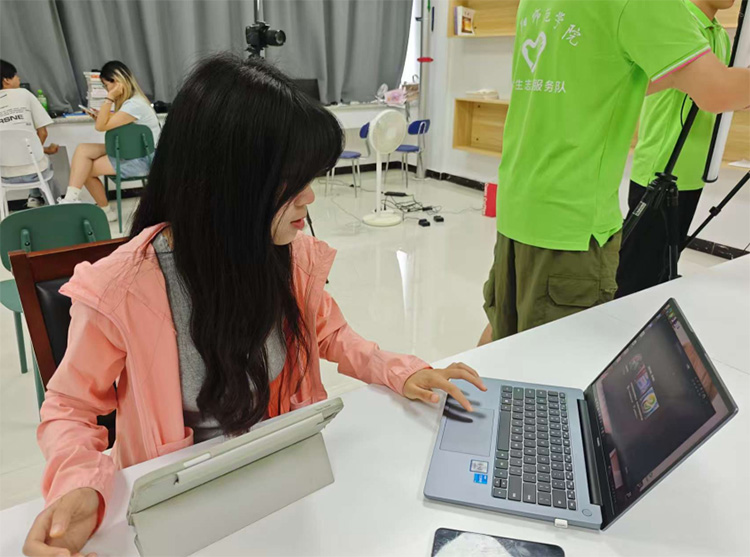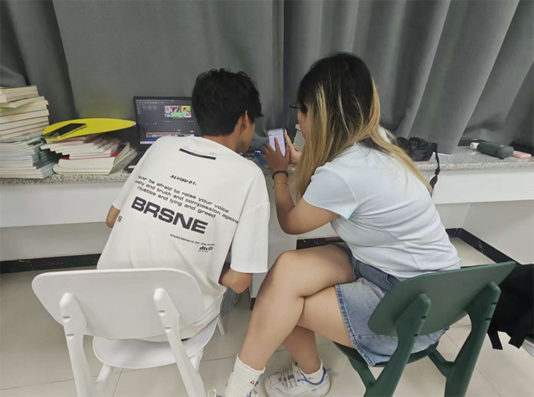 運營組尤怡然正與宣傳推廣視頻組陳海濱討論直播細節(jié)