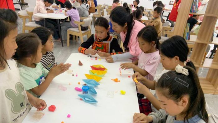 實踐團成員教小朋友折千紙鶴。毛蘭蘭攝