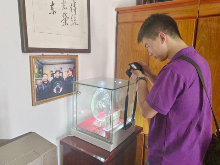 團隊成員在王克昌故居拍攝習總書記贈送的水晶盤 通訊員劉孝忠攝