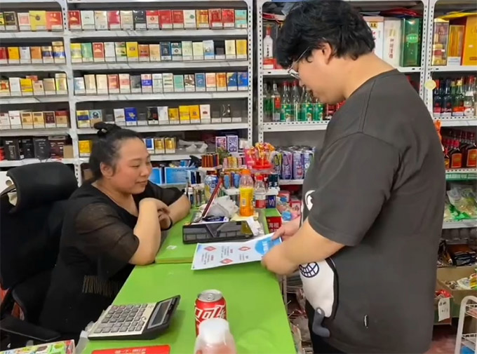 圖:李中福在給居民發(fā)禁毒防艾宣傳單