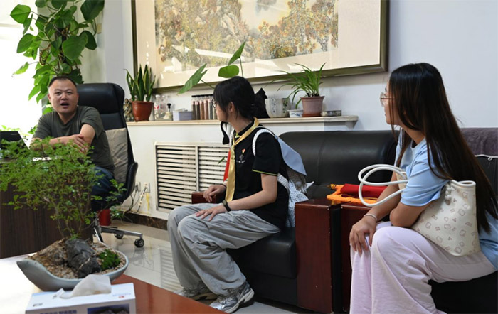 圖為隊員與山東朱老大食品有限公司相關(guān)負(fù)責(zé)人座談張舒桐攝
