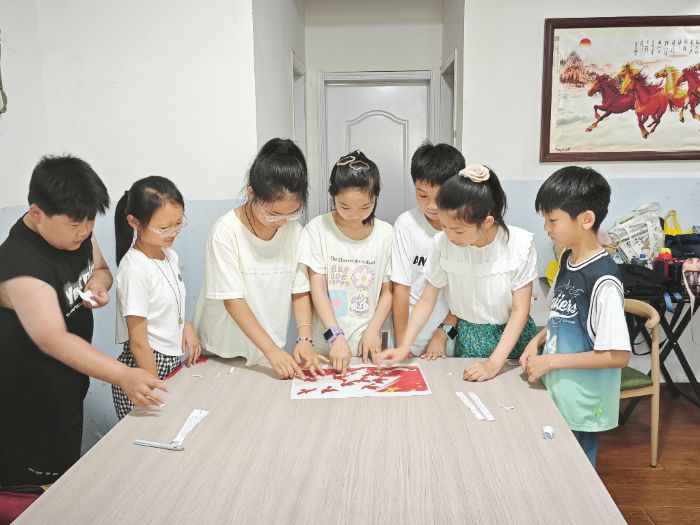 圖為小朋友們在背景紙上粘貼和平鴿 陳苗攝