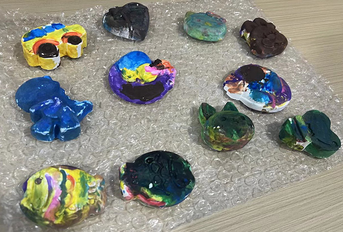 課程中,志愿者們各展所長,傾力為孩子們打造充滿溫情與創意的課堂。團隊成員鄧世麗帶領孩子們進行“植物拓染”創作,在志愿者的協助下,孩子們親手繪制拓染圖案,于動手間感受創造的樂趣;匡宇熙開展“DIY-扭棒成花”課程,讓扭扭棒在孩子們手中化作繽紛的花朵,在鍛煉動手能力的同時,為他們打開了藝術感知的窗口。閱讀課上,謝佳燁引導孩子們“認識情緒”,借助趣味互動,幫助孤獨癥兒童覺察情緒、表達內心;李明遠、白光朔等志愿者帶來“趣味丙烯畫”“DIY-石膏娃娃”等課程,顏料流淌、石膏彩繪,孩子們的天性在色彩與觸感的世界里得到了釋放。
