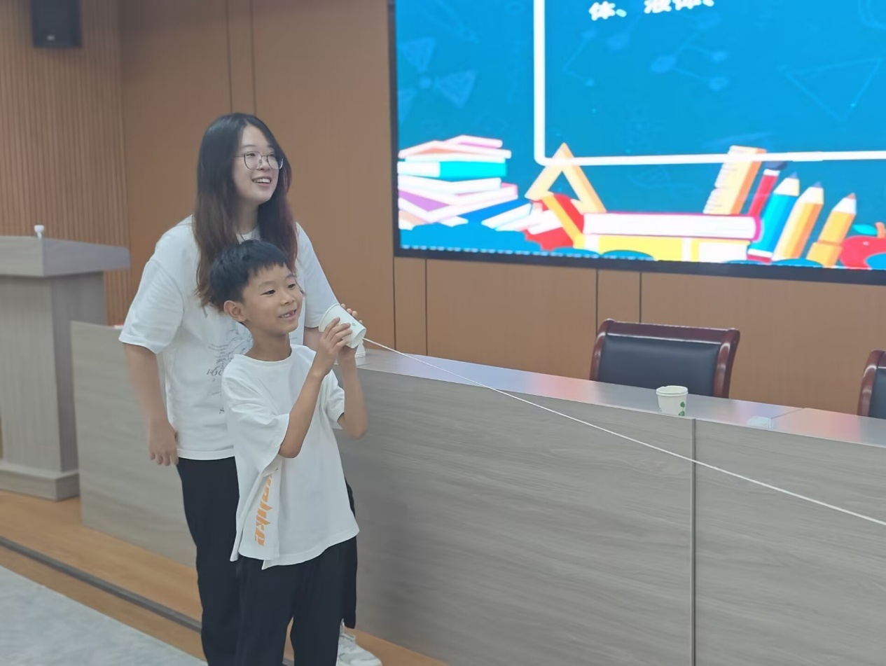 團隊還為孩子們開設“傳聲筒實驗”科普課。團隊成員手持紙杯、棉線,以“聲音如何旅行”為切入點,邊演示邊講解:先在紙杯底部打孔穿線并系緊,再讓兩名孩子背對背拉緊棉線,一人對著紙杯輕聲說話,另一人將耳朵貼近杯口傾聽。“聲音變清晰了!”“線松了就像捂住耳朵!”孩子們在動手操作中直觀理解“固體傳聲”原理,歡笑聲與驚嘆聲此起彼伏。