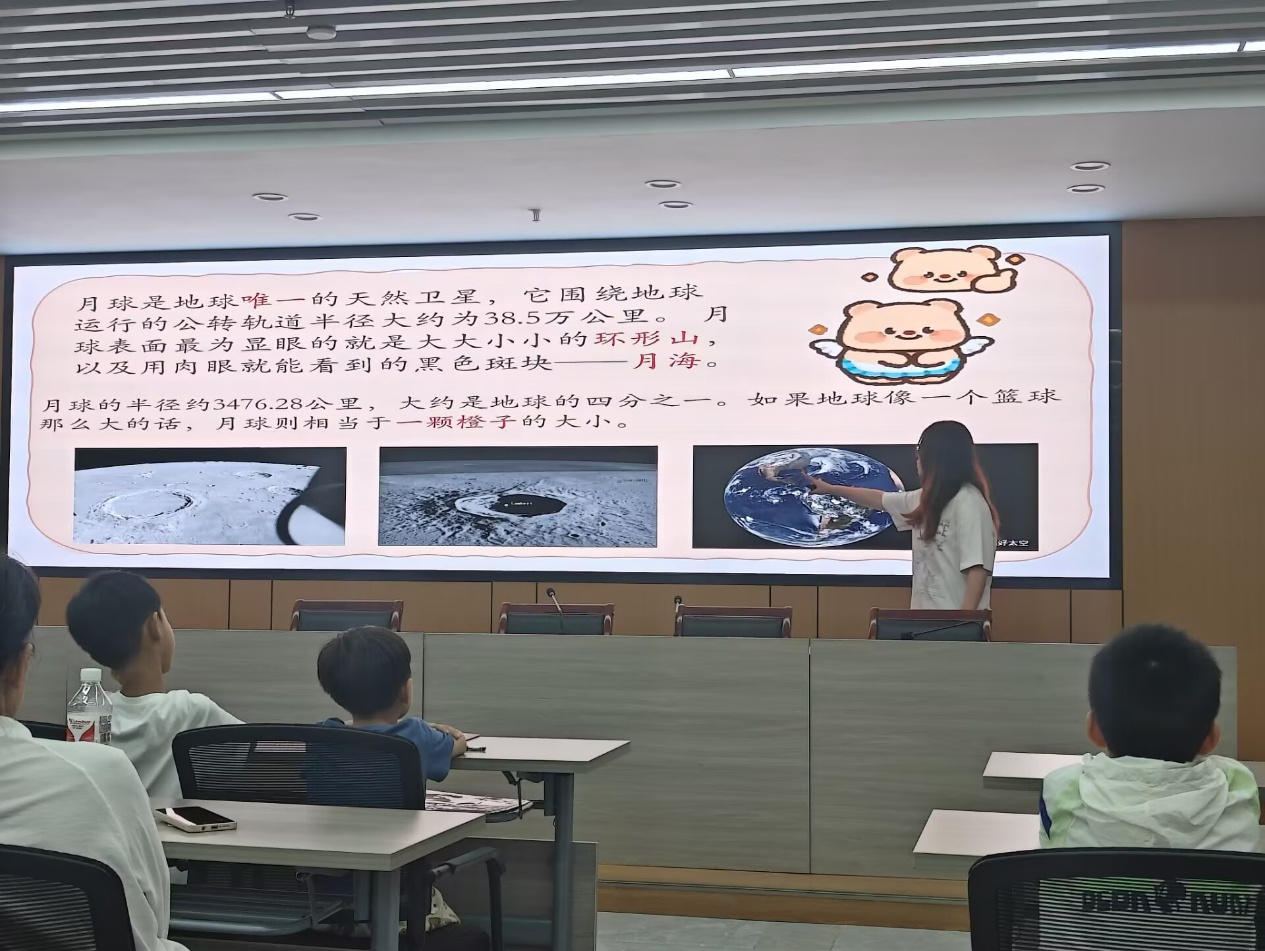 圖為主講人周彥宏為孩子們科普月球和地球。李婉婷供圖。