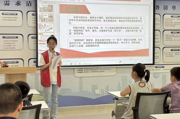 隨后,社會(huì)實(shí)踐隊(duì)員李舒悅和董蕓藝進(jìn)一步深入講解了“使命感”的具體內(nèi)涵,以及如何在日常生活中踐行維護(hù)國(guó)家安全。她們通過(guò)一個(gè)個(gè)貼近生活的小故事,將抽象的概念轉(zhuǎn)化為可感知的行動(dòng)指南:比如看到陌生人拍攝軍事設(shè)施要及時(shí)提醒、不隨意傳播敏感信息、遵守法律法規(guī)等。“如果看到有人偷拍社區(qū)公告欄,要告訴大人!”稚嫩卻堅(jiān)定的聲音,讓在場(chǎng)的社區(qū)工作者和家長(zhǎng)們倍感欣慰。