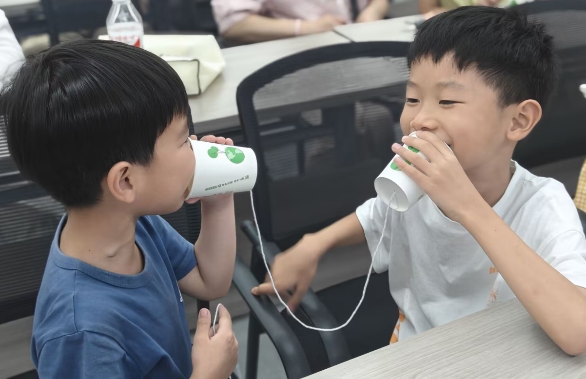 為了讓抽象的科學原理變得直觀易懂,周彥宏專門設計了傳聲筒實驗環節。她展示了用紙杯和棉線制作簡易傳聲裝置,并邀請兩位小朋友上臺演示,一人將紙杯緊貼耳畔,另一人則對著紙杯輕聲細語。當他們發現棉線松弛時聲音無法傳遞,而拉緊棉線后就能清晰聽到對方講話時,周彥宏闡釋原理,“正如月球真空環境無法傳聲,聲波必須依賴介質振動”,小朋友們恍然大悟。隨即現場出現了傳聲筒制作和兩人對話的熱鬧場景,在這一過程中團隊成員悉心指導。實驗過程中,有的小朋友發現線繩打結會影響傳聲效果,有的則嘗試用更長的棉線進行測試,探索精神十足。實驗不僅驗證了固體傳聲的原理,更讓小朋友們在游戲中掌握了科學知識。