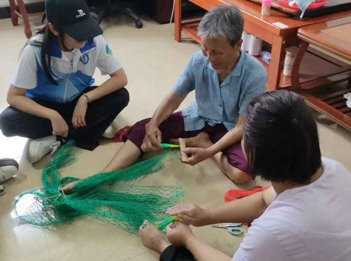 (圖為隊員和阿婆們一起編制漁網(wǎng) 潮聲漁影宣傳組拍攝)