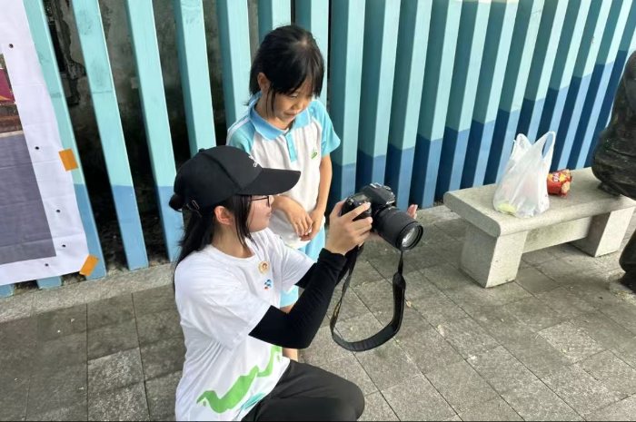 鏡頭藏笑意,一幀抵流年 紅港村屋檐下的青石板凳邊,隊員舉著相機半蹲著身子,取景框里浮動著鮮活的人間煙火。