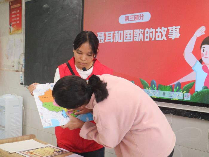 青春誦歌傳薪火,童心推普鑄國魂。在聶耳紀念日主題活動中,推普團通過國家地圖拼圖互動、聶耳故事講述等多種形式,引導學生深入理解國歌的創(chuàng)作背景。此外,還策劃了愛國小劇場,學生們以“愿以吾輩之青春,捍衛(wèi)盛世之中華”的鏗鏘之聲拉開序幕。隨后,通過觀看愛國主義動畫的精彩片段并進行生動表演,孩子們在觀賞與參與中樹立保家衛(wèi)國的觀念。此次活動將普通話推廣與紅色教育有機結(jié)合,既提升了青少年的語言表達能力,又傳承紅色基因,為民族地區(qū)教育注入了新時代的精神力量。