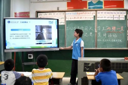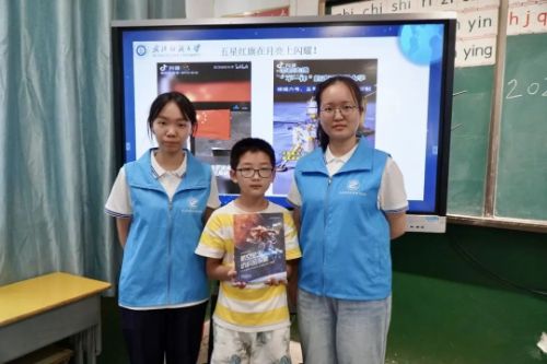 1揚帆未來航藍海,航夢啟程求新知7月7日,支教團以“藍海探索:航天科技揚未來帆”為主題,用生動的案例向孩子們科普航天科技知識,還特別介紹了武漢紡織大學的科研成果——由玄武巖纖維“織”成的五星紅旗,并通過實物圖片和原理演示,讓孩子們感受到“紡織+航天”的跨界創(chuàng)新魅力。恰逢“七七事變”88周年紀念日,支教隊與孩子們展開互動問答,引導孩子們銘記歷史脈絡,傳承民族精神,樹立“為中華之崛起而讀書”的遠大志向。