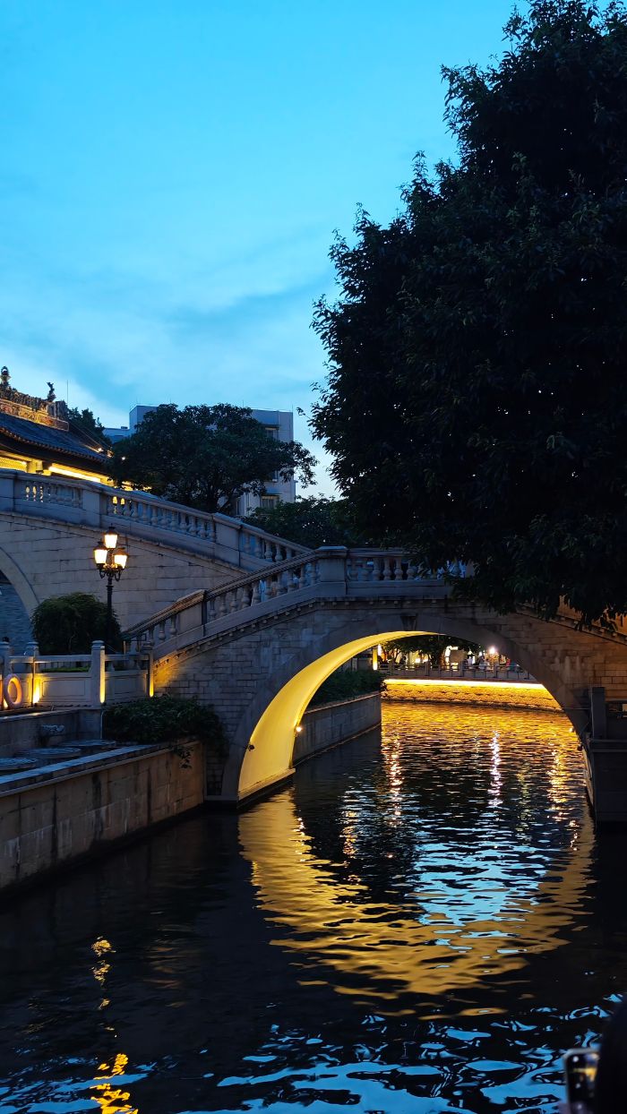夜色為宣,韓江潑墨。當(dāng)團隊行至網(wǎng)紅地標(biāo)"月亮橋",石拱與水影交融成一輪澄明玉環(huán)。現(xiàn)代光學(xué)技術(shù)點染出"天上月落人間河"的奇景,粼粼波光中倒映著粵博的鑊耳輪廓與牌坊的巍然剪影。