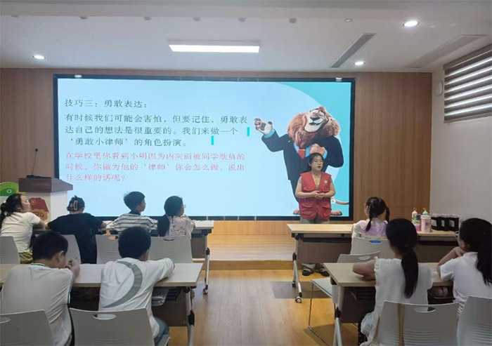 在“自信小律師:我的聲音很重要”課堂上,孩子們則經歷了一次表達能力的飛躍。課程精心設計了圍繞校園生活、家庭關系等貼近孩子們實際的小小“辯論”與“模擬發言”環節。在輕松安全的氛圍中,孩子們被鼓勵清晰地陳述自己的觀點,學習有理有據地表達想法和訴求。老師通過即時反饋和技巧點撥,幫助孩子們克服膽怯,提升邏輯思維與語言組織能力。“以前我不敢在很多人面前說話,今天老師夸我講得有條理,我特別開心!”一位首次嘗試發言的學生興奮地說。這門課為孩子們搭建了鍛煉自信、學習有效溝通的寶貴平臺,賦予他們勇敢發聲、表達自我的力量。
