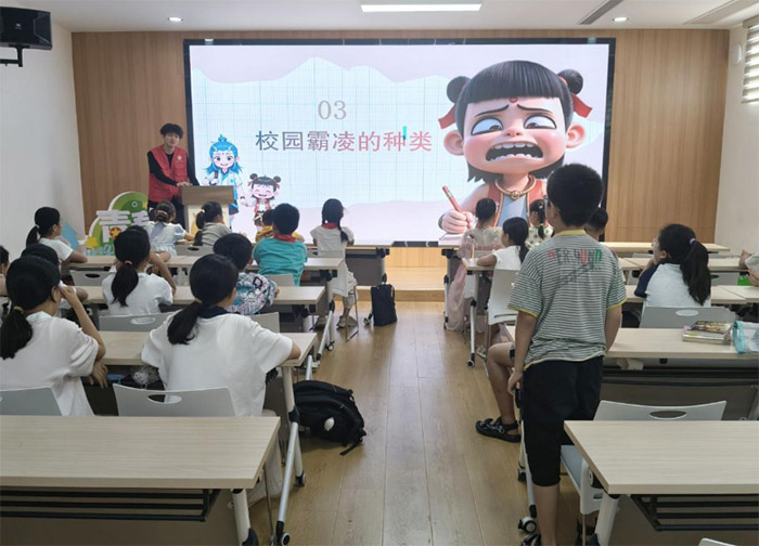 針對校園安全這一重要課題,專門設置了“法不向不法低頭——拒絕校園霸凌”主題課。課堂摒棄了枯燥說教,通過真實案例分析、小組討論與情景模擬,引導孩子們清晰辨別霸凌行為,深刻理解其危害性。孩子們在老師帶領下共同探討“如何應對”與“如何幫助他人”,學習運用法律武器保護自己和身邊同學。“我知道了勇敢說‘不’和尋求幫助很重要,沉默只會讓霸凌者更囂張。”一位參與討論的學生認真分享道。這堂課在孩子們心中深深埋下了尊重他人、保護自我、勇敢向不法行為說“不”的法治種子。