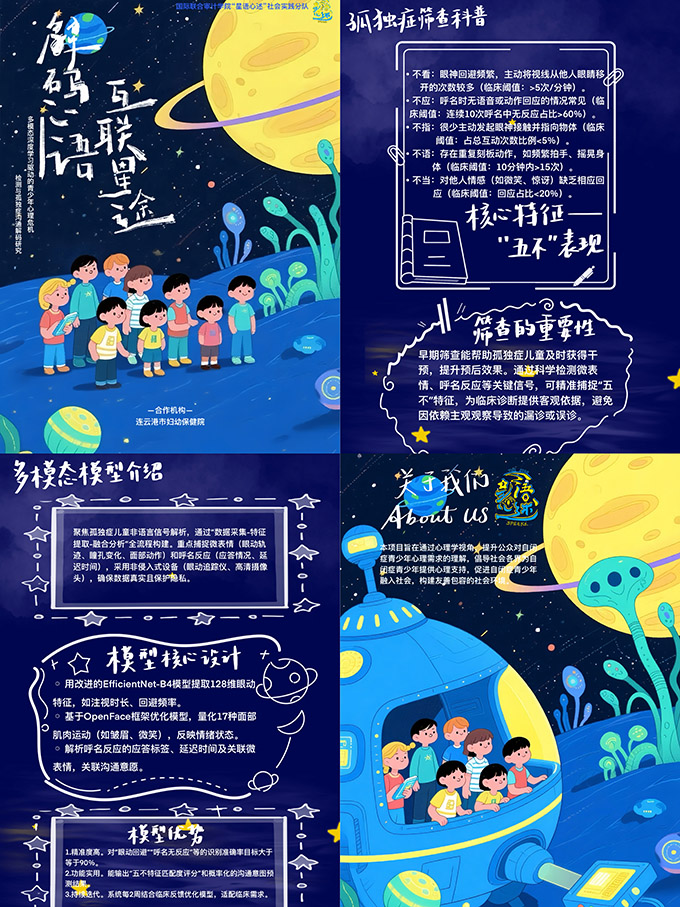 實踐共進—以行動鑄就“星”閃亮 團隊于連云港婦幼保健院一行中,深化了孤獨癥譜系兒童檢測篩查的相關知識經驗,激勵成員們對于模型設計的迭代精進。團隊聚焦孤獨癥兒童非語言信號解析,構建了“數據采集—特征提取—融合分析”全流程模型,并梳理成模型平臺應用手冊。通過非侵入式設備,如眼動追蹤儀、高清攝像頭等,精準捕捉微表情與呼名反應等核心信號。具體的設計層面,成員計劃以EfficientNet-B4模型、OpenFace框架等提取眼動特征,面部肌肉運動,精準識別關鍵指標,進行時序分析;解析呼名反應中的溝通意愿關聯信號。