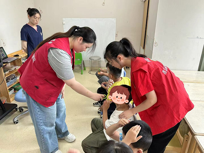課堂共融—用互動點亮“星”世界 團隊成員融入自閉癥兒童的課堂,與老師默契配合,用專業與愛心開展互動教學。在聽說課堂上,成員們為孩子指著白板上的簡單漢字,重復發音,引導他們模仿口型;隨后,成員以彩色拼圖輔助課堂,通過“找伙伴”游戲鼓勵孩子識別相同顏色——當孩子成功將紅色拼圖塊歸到一起時,成員們立刻送上掌聲,用笑容傳遞肯定。