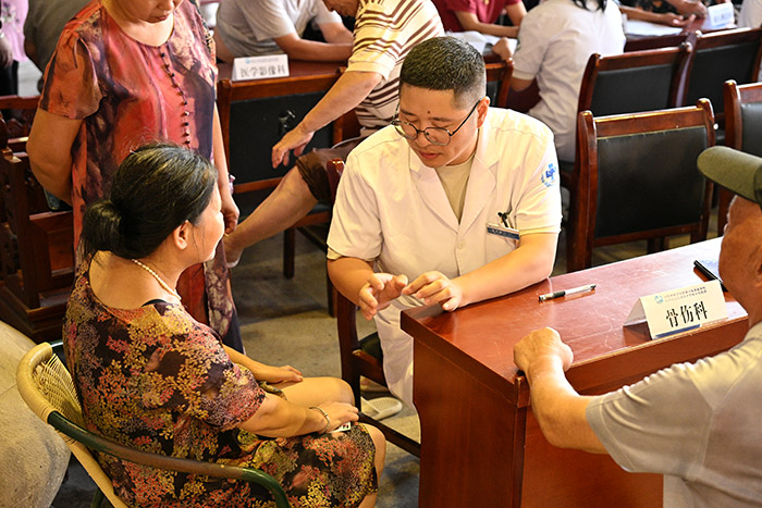 中醫骨傷科的龐衛祥醫生耐心地為61歲的許奶奶檢查關節、望舌苔、把脈問診,并細致地教授她如何按摩手上的穴位來緩解不適。“醫生講得很清楚,按按這里,我這老胳膊老腿真的舒服些了。”老人們樸實的反饋,成為校地協作模式服務基層實效的有力證明。