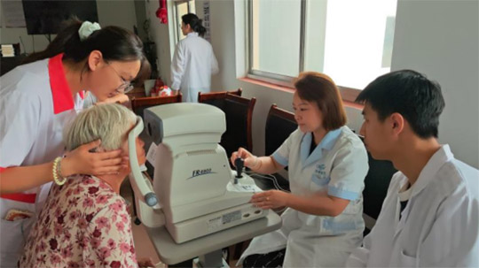 清晨,實踐隊隊員攜帶專業眼科檢查設備抵達西解甲莊村活動中心。現場早已聚集了眾多村民,隊員們迅速布置場地,設置視力檢測區、眼病咨詢區及健康宣教區,以及血壓血糖等基礎檢查區。義診過程中,專家為村民進行了細致的視力篩查、驗光儀檢查及眼底檢查,針對老花眼、白內障、青光眼、干眼癥等常見眼病提供專業診斷,并根據個體情況制定治療建議。