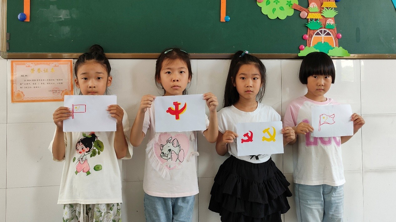 黑板旁的榮譽證書見證成長,四位小女孩手持親手繪制的黨旗、隊旗,成為紅色符號的 “小小傳承人”。她們認真舉著作品,眼神里透著對圖案意義的深刻理解 —— 黨旗的鐮刀錘頭、隊旗的星星火炬,不再只是符號,而是化作心底對信仰的向往。這一場 “巧手創作”,讓紅色基因以具象化的方式,在孩子們手中傳遞、扎根。