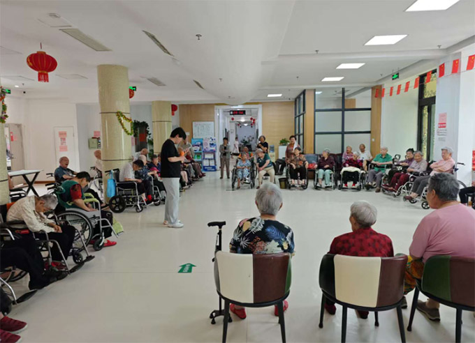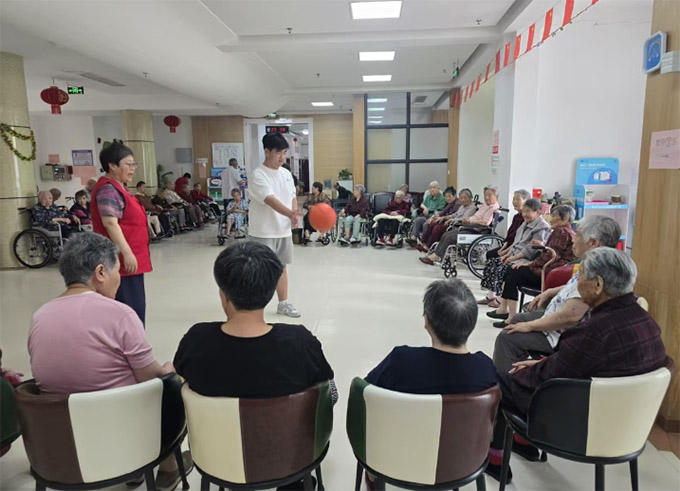 才藝表演環(huán)節(jié)成為活動(dòng)的暖心高潮:經(jīng)典老歌聯(lián)唱中,《夕陽(yáng)紅》等熟悉旋律引得老人輕聲跟唱;簡(jiǎn)易魔術(shù)里,硬幣消失的奇妙瞬間讓老人展露孩童般的好奇;跆拳道的剛勁與詩(shī)朗誦的深情交替上演,不時(shí)收獲老人們默契的掌聲。隨后,志愿者們配合護(hù)理中心工作人員,帶著老人們開(kāi)展低強(qiáng)度球類(lèi)活動(dòng),輕便的球體在歡聲笑語(yǔ)中傳遞,既兼顧了老人的身體狀況,又讓活力與互動(dòng)充盈著整個(gè)空間。
