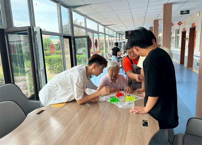 在養老中心的休閑區域,實踐團成員與老人開啟跳棋“棋藝切磋”。彩色棋子在棋盤上流轉,成員們俯身觀察、認真落子,和老人一同在對弈中,讓青春朝氣與長者的生活智慧交融,把陪伴化作棋局里的溫暖互動。