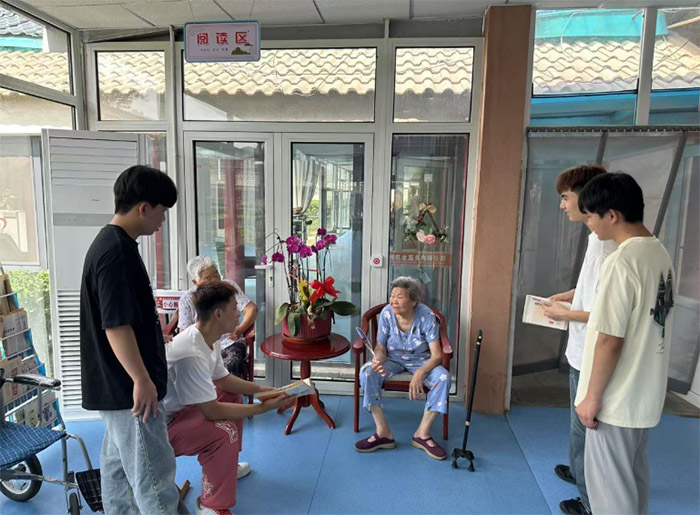 為了給予養老中心的老人送去精神慰藉,實踐團成員們走進“閱讀區”。他們手持書籍,圍在長者身旁,或蹲身、或站立,捧著書籍輕聲分享,讓書香漫入老人的日常,與老人的笑聲交織連通代際溫暖,在陪伴里書寫敬老愛老的實踐篇章。