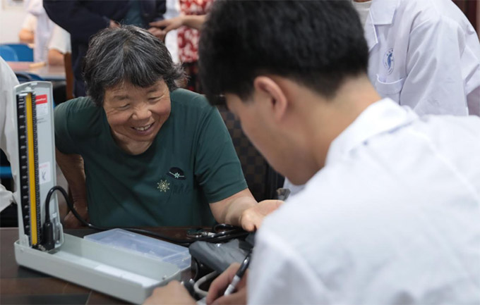 圖為實(shí)踐團(tuán)成員為敬老院老人測(cè)量血壓。(李玟供圖)