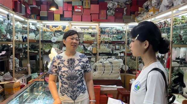 林老板介紹道,市面上的石敢當雕刻設計大多簡單而相似,文化底蘊極低,制造則主要采用機器流水線生產,要想出彩只能從制造工藝下功夫,因此她堅持手工雕刻為主、機器輔助為輔的制造模式。她還向團隊成員詳細展示了玉雕從選料、打胚、塑形到上色的完整流程,并結合自身多年的從業經驗,對比分析了手工雕刻與機器雕刻的差異,她強調機器雕刻的作品缺少靈性,在價值上遠不及手工雕刻產品。雖然手工雕刻的成本極高,但林老板依然堅守著初心,不斷嘗試帶領手工雕刻行業走出困境。通過與林老板的交流以及對市場內其他攤位的走訪,團隊對傳統手工雕刻的技法傳承和經營現狀有了初步的直觀認識。