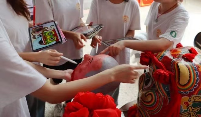 圖為"舞躍獅騰"繪畫組向老傳承人請教貓頭獅圖案 陳彤?dāng)z