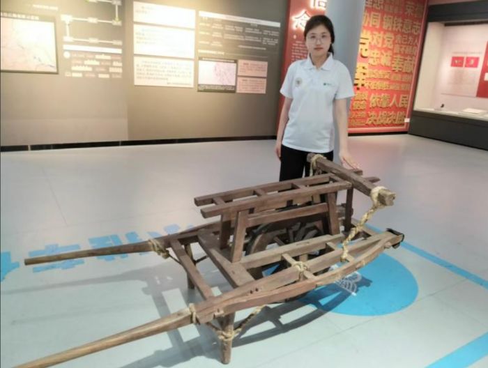 圖為團(tuán)隊(duì)成員體驗(yàn)支前小推車。姜博雅供圖。