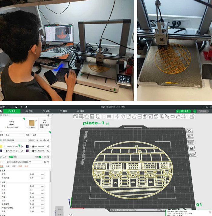 三、借數(shù)字創(chuàng)新拓寬非遺傳承,讓影響“走得遠(yuǎn)” 0.1毫米的掐絲誤差,曾是匠人十年的功力門檻。如今,建模技術(shù)讓能讓沒有“十年功”的我們,也能觸摸到非遺技藝的精準(zhǔn)內(nèi)核。團(tuán)隊(duì)以“數(shù)字建模+3D打印+手工精做”的方式,既留存了傳統(tǒng)掐絲琺瑯畫中彩砂裝填的鮮活質(zhì)感,又為這門古老技藝開辟了新的傳承賽道——團(tuán)隊(duì)成員使用NX、Solidworks、Blender、bambustudio等軟件探索線稿建模,驅(qū)動(dòng)3D打印復(fù)刻傳統(tǒng)掐絲軌跡,數(shù)字技術(shù)正一步步將傳統(tǒng)手工里的“手感經(jīng)驗(yàn)”,轉(zhuǎn)化為可復(fù)制、可學(xué)習(xí)的標(biāo)準(zhǔn)化流程。與此同時(shí),團(tuán)隊(duì)以非遺作品為媒介,探索制作云游上海紅色地標(biāo)小程序,在新時(shí)代中,讓紅色文化搭載著非遺文化實(shí)現(xiàn)更為廣域的傳播。